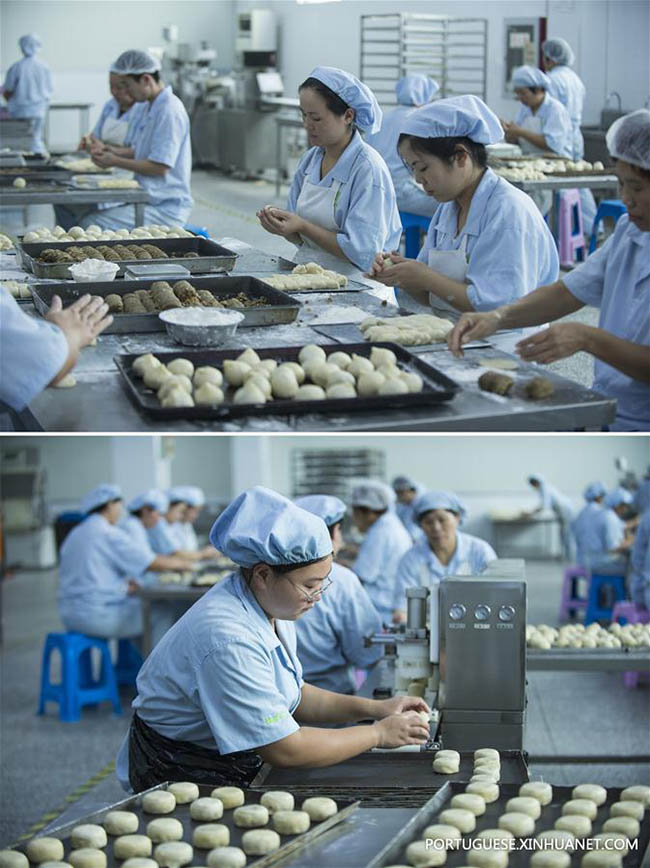 | Funcionários fazem bolinhos da lua em uma fábrica de alimentos em Nanjing, capital da província de Jiangsu, no leste da China, em 25 de setembro de 2017. |