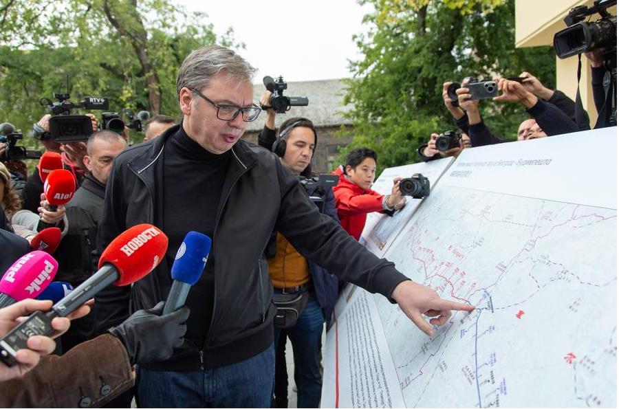 O presidente sérvio Aleksandar Vucic observa um painel da ferrovia de alta velocidade Hungria-Sérvia em Subotica, Sérvia, em 3 de outubro de 2025. (Shi Zhongyu/Xinhua)