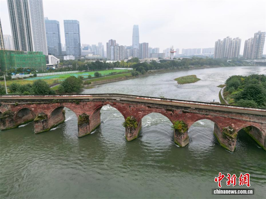 Vista aérea da Ponte Antiga do Templo Erjiang, em Chengdu, província de Sichuan, mostra uma espada de ferro pendurada em seu arco central sobre o Rio Jinjiang, criando o espetáculo da "Espada Pendurada na Ponte Antiga", em 31 de outubro de 2025.