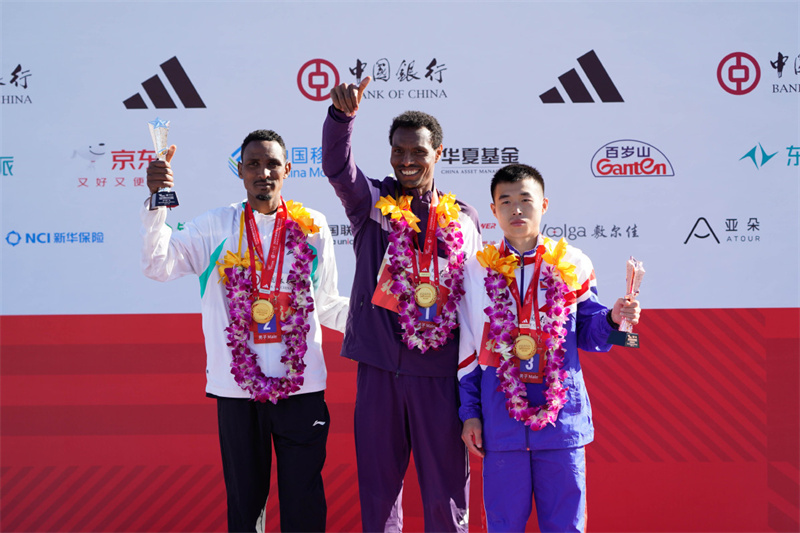 Lemi Berhanu Hayle (C), da Etiópia, primeiro colocado, posa com Desalegn Girma Debel (E), também da Etiópia, segundo colocado, e Han Il Ryong, da República Popular Democrática da Coreia (RPDC), terceiro colocado, durante a cerimônia de premiação da maratona masculina da Maratona de Beijing 2025, em Beijing, em 2 de novembro de 2025. [Foto/Xinhua]