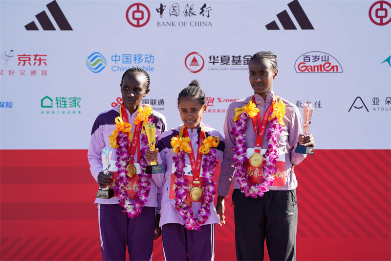 A primeira colocada, Anchinalu Dessie Genaneh (C), da Etiópia, posa com a segunda colocada Marion Jepkonga Kibor (L), do Quênia, e a terceira colocada Kuftu Tahir Dadiso, da Etiópia durante a cerimônia de premiação da maratona feminina na Maratona de Beijing 2025, 2 de novembro de 2025. [Foto/Xinhua]