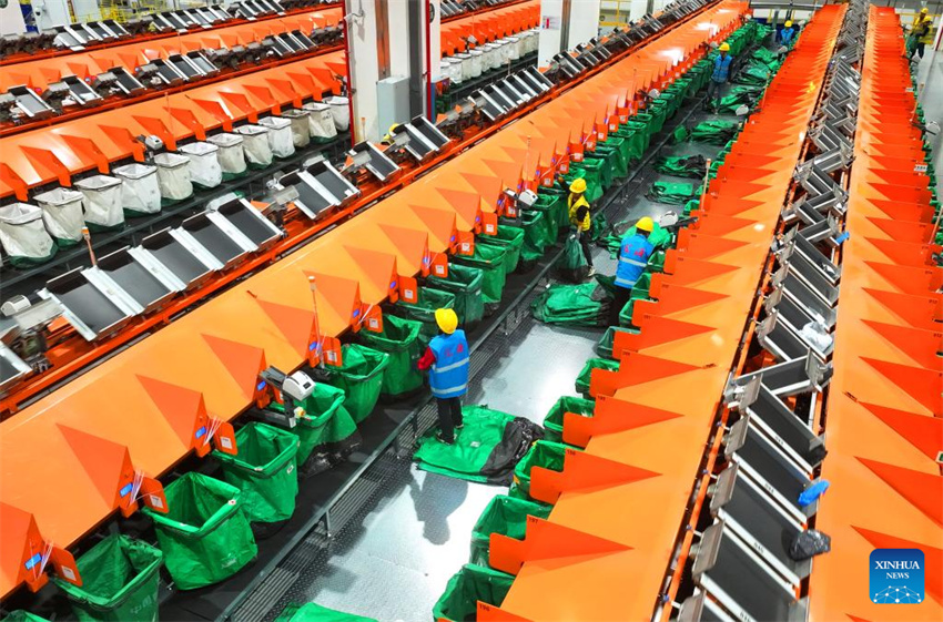 Funcionários separam encomendas numa agência dos Correios da China na cidade de Hengyang, província de Hunan, no centro da China, em 11 de novembro de 2025. Empresas de comércio eletrônico e logística em toda a China estão operando a plena capacidade durante o festival anual de compras do "Duplo 11". (Foto: Cao Zhengping/Xinhua)