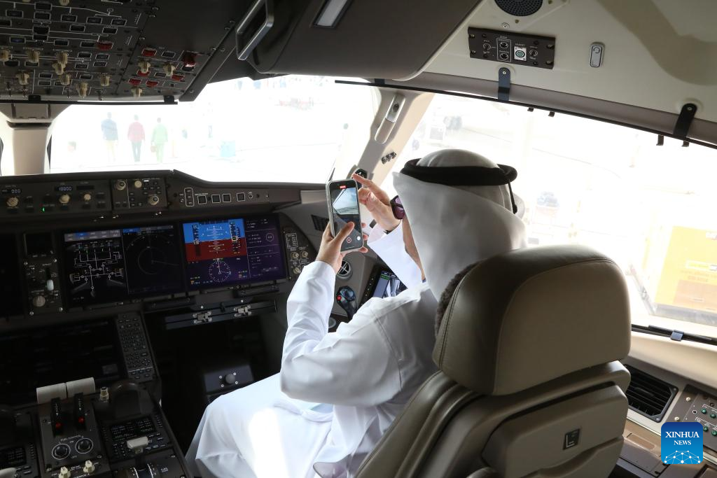 Visitante dos Emirados Árabes Unidos sentado em uma aeronave C919 na 19ª edição do Dubai Airshow, em Dubai, Emirados Árabes Unidos (EAU), em 17 de novembro de 2025. (Xinhua/Wen Xinnian)