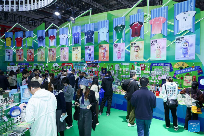 Visitantes observam produtos culturais e criativos da Liga de Futebol de Cidades de Jiangsu numa área de exposição da província de Jiangsu, durante a 6ª Exposição Internacional das Indústrias Culturais do Delta do Rio Yangtzé, em Shanghai, no leste da China, em 20 de novembro de 2025. (Foto: Wang Xiang/Xinhua)