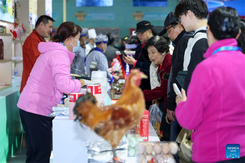Visitantes degustam comidas típicas numa área de exposição da província de Jiangsu, durante a 6ª Exposição Internacional das Indústrias Culturais do Delta do Rio Yangtzé, em Shanghai, no leste da China, em 20 de novembro de 2025. (Foto: Wang Xiang/Xinhua)