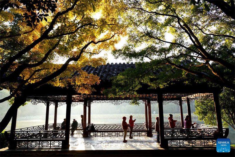 Turistas fazem exercícios matinais em um pavilhão na área turística do Lago Oeste em Hangzhou, província de Zhejiang, leste da China, em 21 de novembro de 2025. (Foto: Zhuang Yingchang/Xinhua)