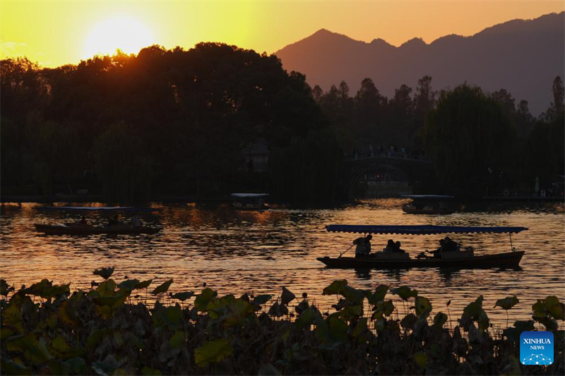 Área cênica do Lago Oeste ao pôr do sol em Hangzhou, província de Zhejiang, leste da China, em 20 de novembro de 2025. (Huang Zongzhi/Xinhua)