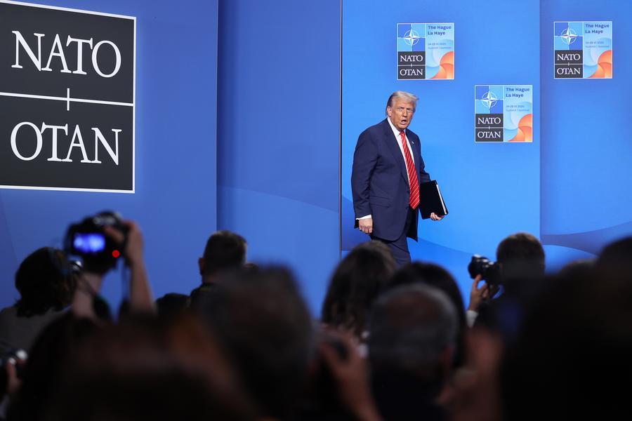 O presidente dos EUA, Donald Trump, participa numa conferência de imprensa após a cimeira da NATO em Haia, nos Países Baixos, a 25 de junho de 2025. (Zhao Dingzhe/Xinhua)
