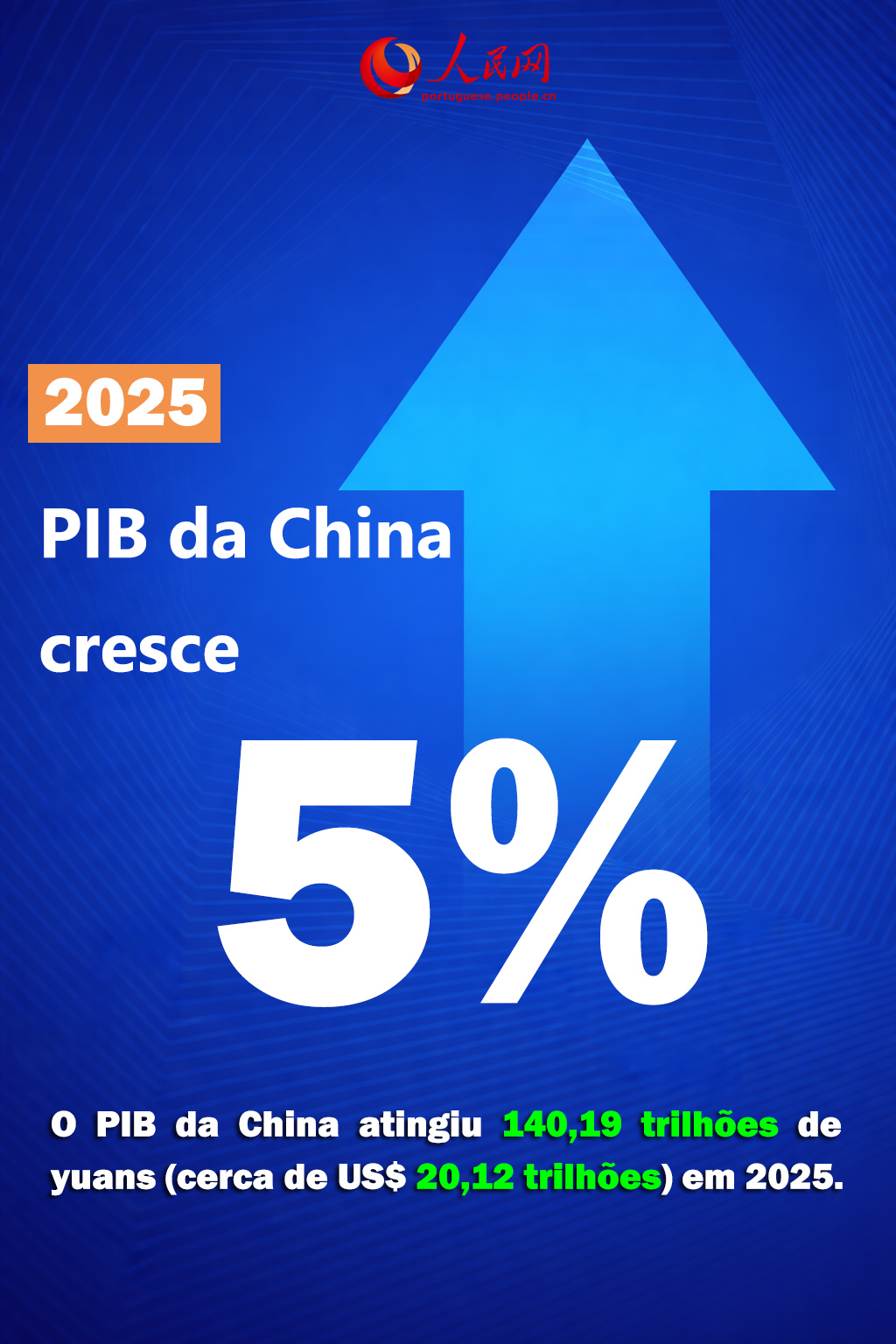 O Produto Interno Bruto (PIB) da China atingiu 140,19 trilhões de yuans (cerca de US$ 20,12 trilhões) em 2025, um aumento de 5% em relação ao ano anterior, de acordo com o relatório econômico divulgado pelo Departamento Nacional de Estatísticas (DNE) da China, na segunda-feira.
