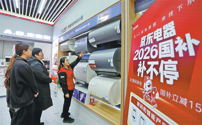 Consumidores observam aquecedores de água com subsídios para troca em um mercado de Jiaxing, província de Zhejiang. Foto: Jin Peng, China Daily