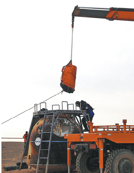 Traje espacial é retirado da cápsula de retorno por um guindaste após seu pouso seguro na segunda-feira.