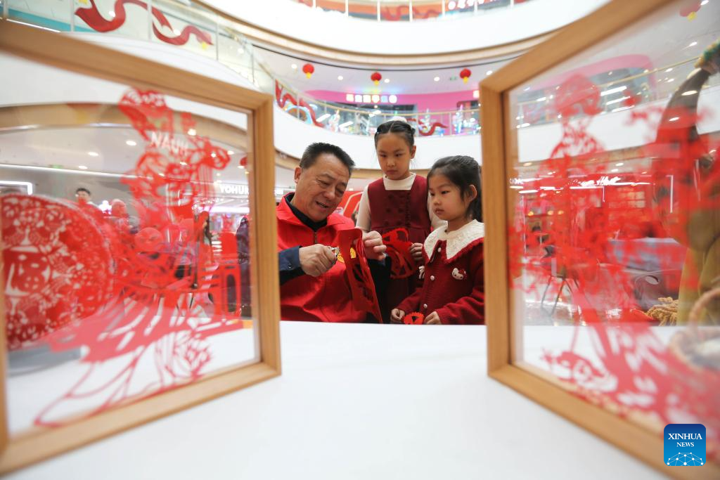 Artesão de recorte de papel ensina crianças em um shopping center em Dingxi, província de Gansu, noroeste da China, em 4 de fevereiro de 2026. (Foto: Wang Kexian/Xinhua)