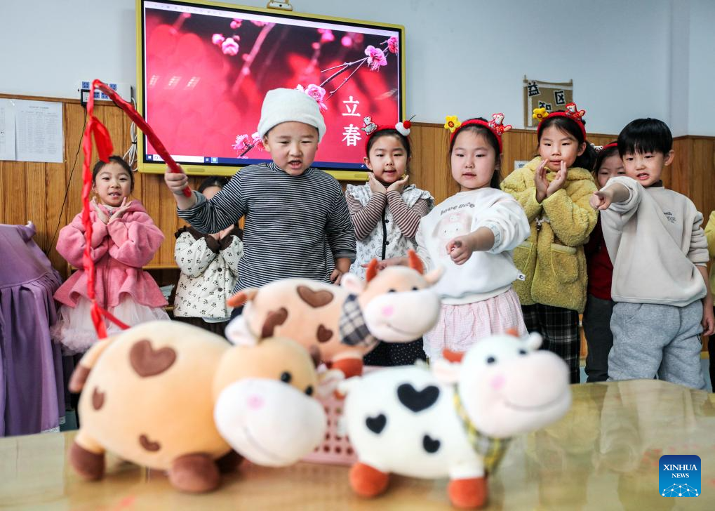 Brincadeira tradicional realizada por ocasião do "Lichun", em um jardim de infância em Jiaozuo, província de Henan, no centro da China, em 4 de fevereiro de 2026. (Foto: Cheng Quan/Xinhua)