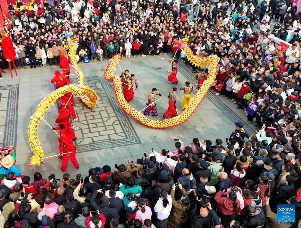 Pessoas assistindo a uma dança do dragão por ocasião do "Lichun", em Nanyang, província de Henan, no centro da China. (Foto: Gao Song/Xinhua)