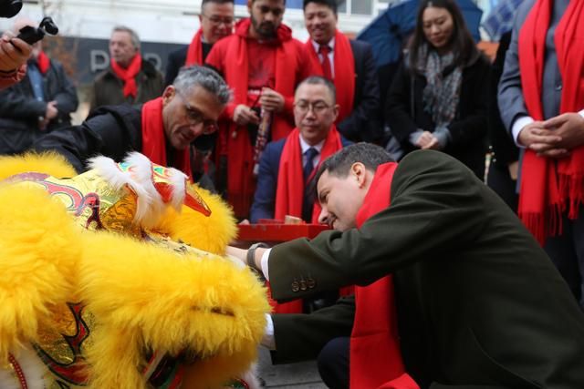 Durante as celebrações do Ano Novo Chinês, o presidente da Câmara Municipal de Braga, João Rodrigues, participa no ritual de pintar os olhos do leão. (Foto: Xun Wei / Xinhua)
