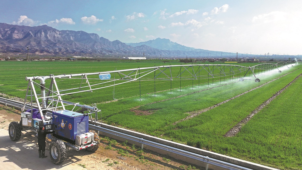 Um trabalhador opera um sistema inteligente de irrigação e fertilização num campo de trigo, numa zona de agricultura inteligente no condado de Jishan, em Yuncheng, província de Shanxi, em 31 de março de 2026. O condado está promovendo uma agricultura com uso eficiente da água, adotando tecnologias de irrigação inteligente e equipamentos de pulverização não tripulados, o que ajuda a reduzir custos ao mesmo tempo em que melhora a eficiência. (Foto: Li Lujian/China Daily)