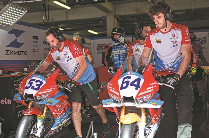 Duas motocicletas fabricadas pela montadora chinesa ZXMOTO estão prontas para a ação na categoria World Supersport, durante a etapa portuguesa do Campeonato Mundial de Superbike, em Portimão, Portugal. (Foto: China Daily)