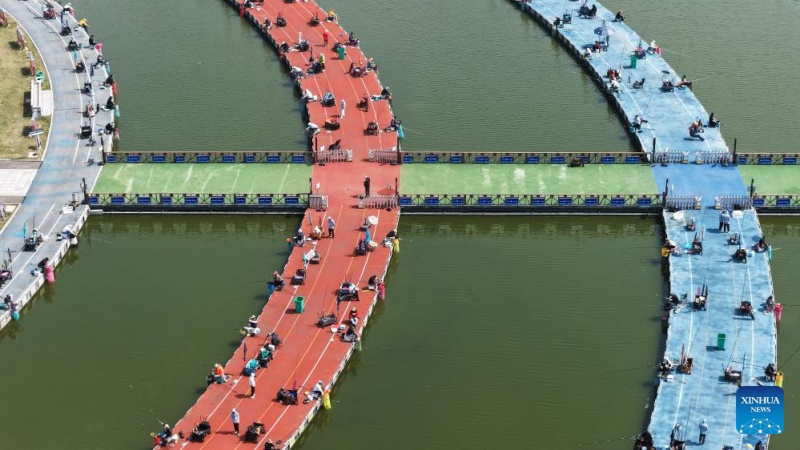 Entusiastas da pesca participando de uma competição durante o feriado do Festival Qingming, no condado de Sihong, província de Jiangsu, leste da China, em 4 de abril de 2026. (Foto: Xu Changliang/Xinhua)