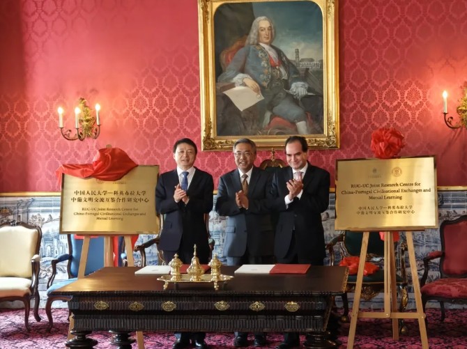O reitor da Universidade Renmin, o vice-reitor da Universidade de Coimbra e representantes de ambas as instituições estiveram igualmente presentes.